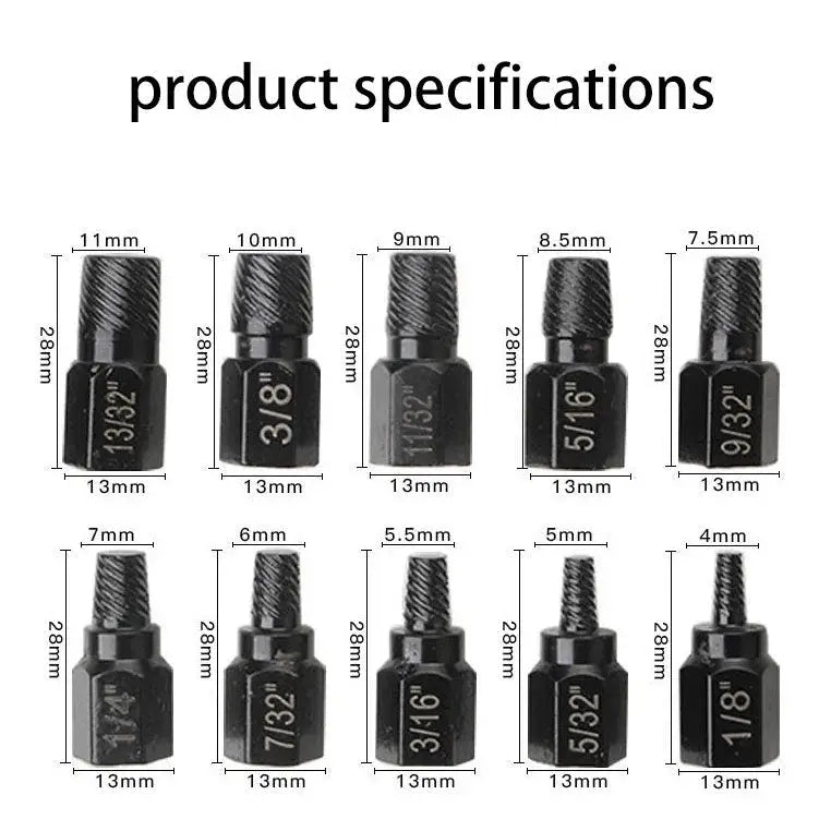 10-Piece Screw Extractor Kit: This Bolt Extractor Set includes a range of sizes from 1/8 inch (3.5mm) to 13/32 inch (10.3mm), with increments of 1/32 inch.![]()